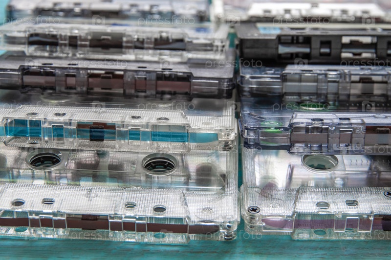 На синем фоне две стопки аудиокассет. Выборочный фокус