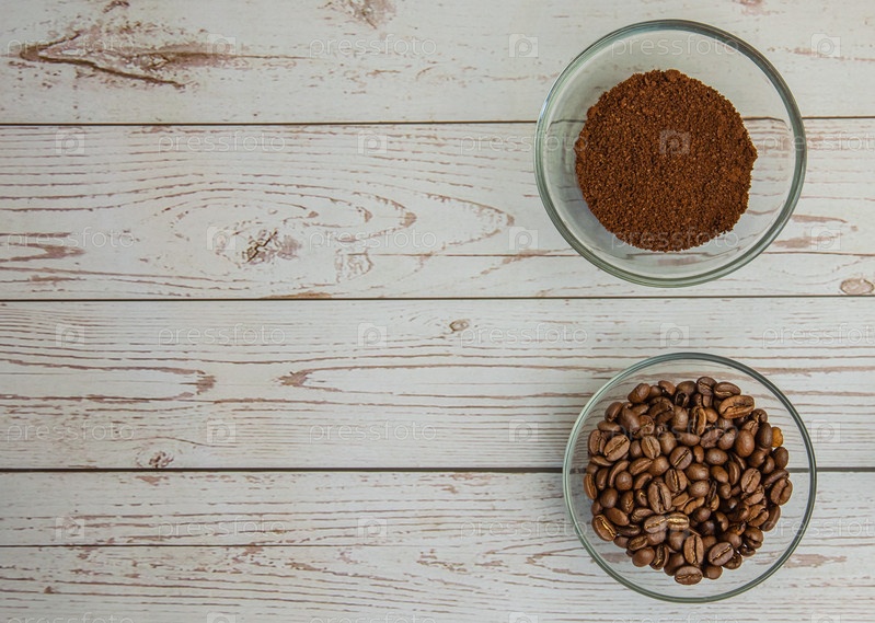 На светлом деревянном фоне стоят две миски с молотым кофе и кофейными зернами. Вид сверху