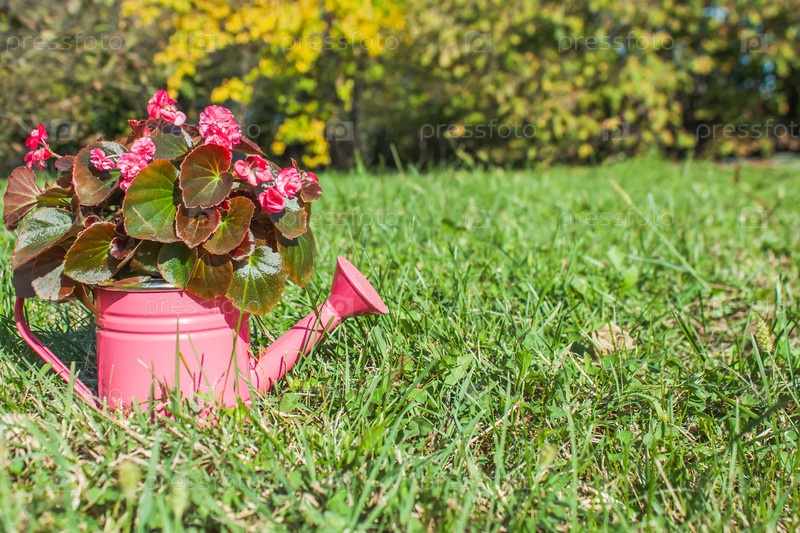 Комнатный цветок Бегония в декоративной розовой лейке на лужайке в зеленой траве