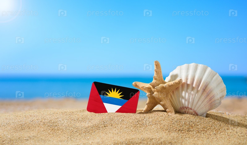 Тропический пляж с ракушками и флагом Антигуа и Барбуды. Концепция райского отдыха на пляжах Антигуа и Барбуда