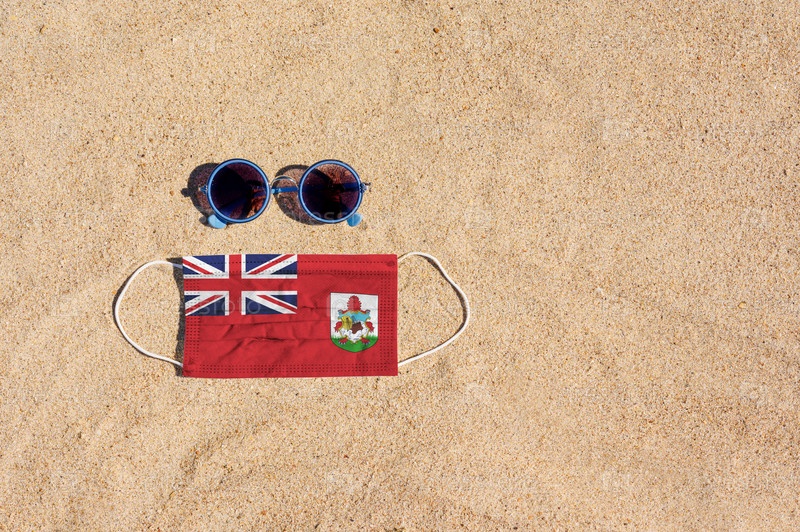 Медицинская маска цвета флага Бермудских островов лежит на песчаном пляже рядом с очками. Концепция организации безопасного пляжного отдыха на Бермудских островах в период пандемии коронавируса