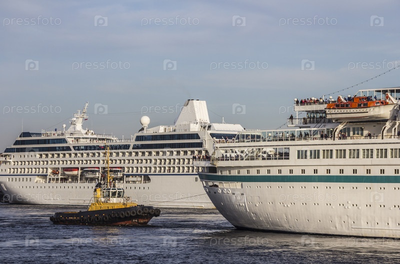 Пилоты и буксиры маневрируют огромными круизными лайнерами и поворачивают их в открытое море