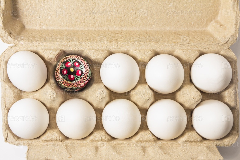 Пасхальное яйцо ручной работы, украшенное народной культурой, упаковано в переработанную картонную коробку среди белых простых яиц. скоро пасха
