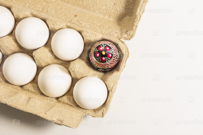 Пасхальное яйцо ручной работы, украшенное народной культурой, упаковано в переработанную картонную коробку среди белых простых яиц. скоро пасха