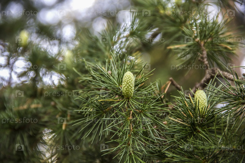 Детали ветки с маленькими молодыми шишками старого ливанского кедра