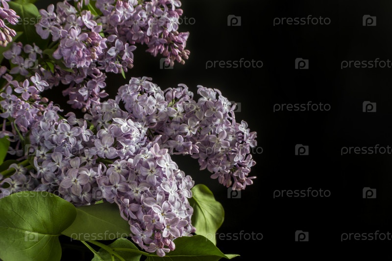 Красивый букет фиолетовых сиреневых цветов крупным планом на черном или зеленом фоне с каплями воды