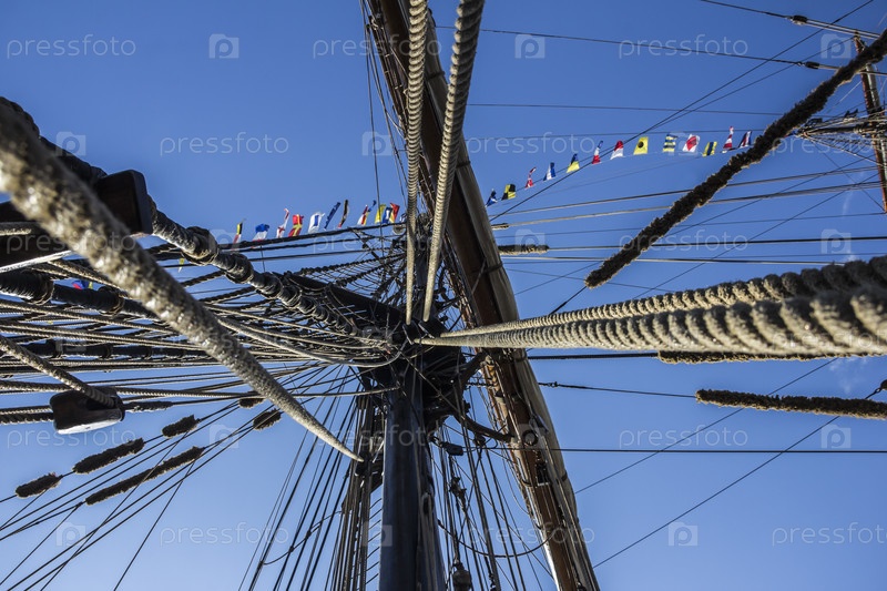 Морская часть яхты или большой старый парусник со шнурами, такелажем, парусом, мачтами, узлами, сигнальными флагами перед голубым небом