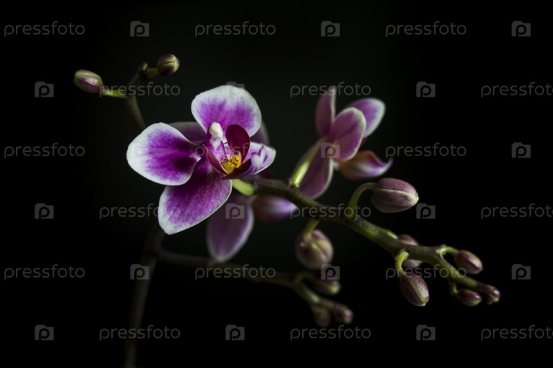 Ветвь орхидеи с бутонами и цветами на черном фоне