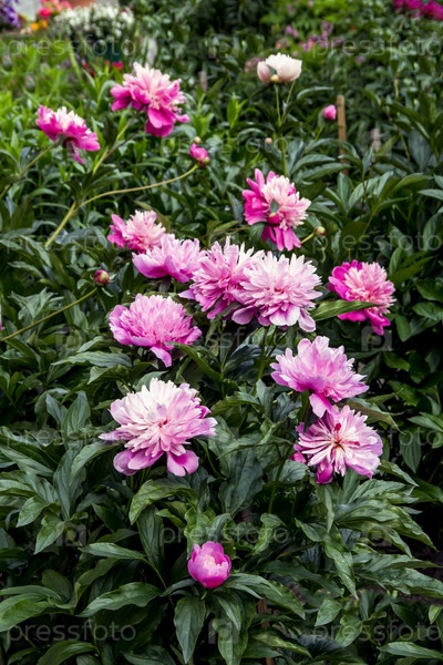 Красивые свежие ароматные розовые пионы на зеленых кустах в саду