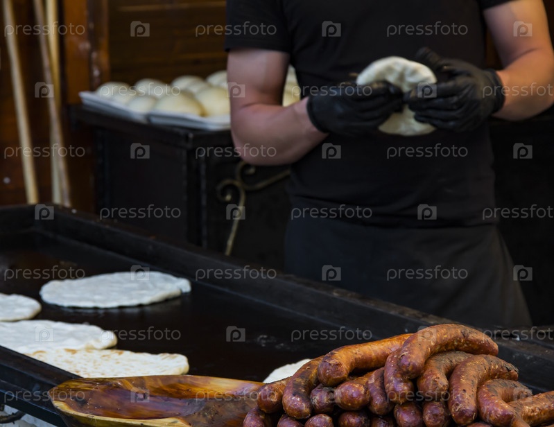 Традиционные венгерские блюда (тушеные овощи и мясо, гуляш, ветчина, лепешка и сосиски) на уличной ярмарке на площади Воросмарти, Будапешт, Венгрия