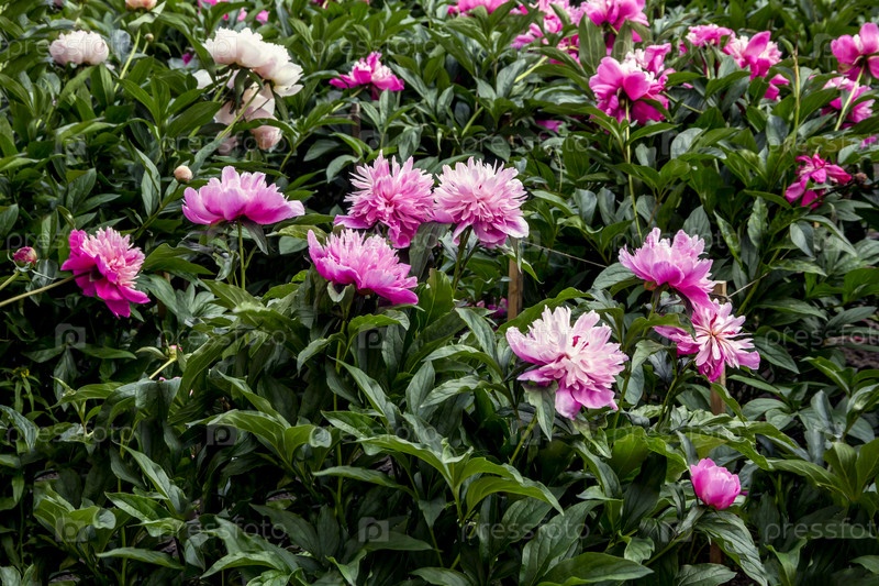 Красивые свежие ароматные розовые пионы на зеленых кустах в саду
