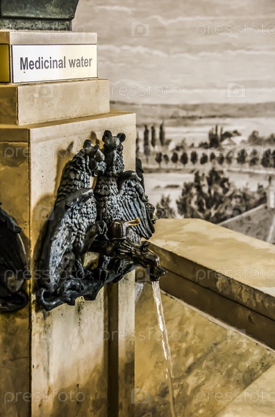 Кран с минеральной водой из горячего источника. На фото кран с минеральной водой, выполненный в старинном античном стиле, украшенный в виде утиной головы и орлиных зверей. Европа, Венгрия, Хевиз