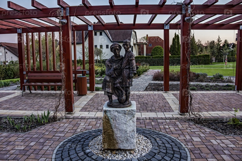 Местная достопримечательность: Статуя Девы Марии и юного Флавия, будущего римского императора (легенда о его выздоровлении) в музее римских поселений региона, Хевиз, деревня Эгредь, Венгрия, 08 апреля 2018 г