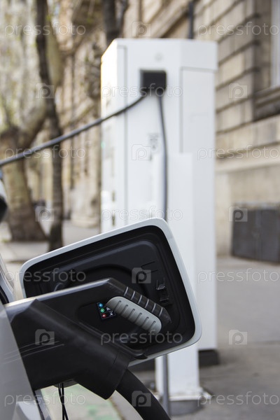 Блок питания для зарядки электромобилей. Станция зарядки электромобилей. Крупный план источника питания, подключенного к заряжаемому электромобилю