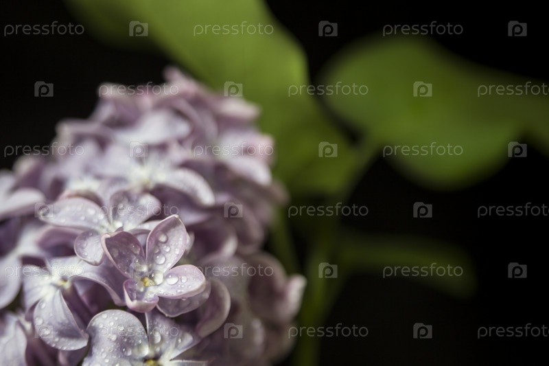 Красивый букет фиолетовых сиреневых цветов крупным планом на черном или зеленом фоне с каплями воды