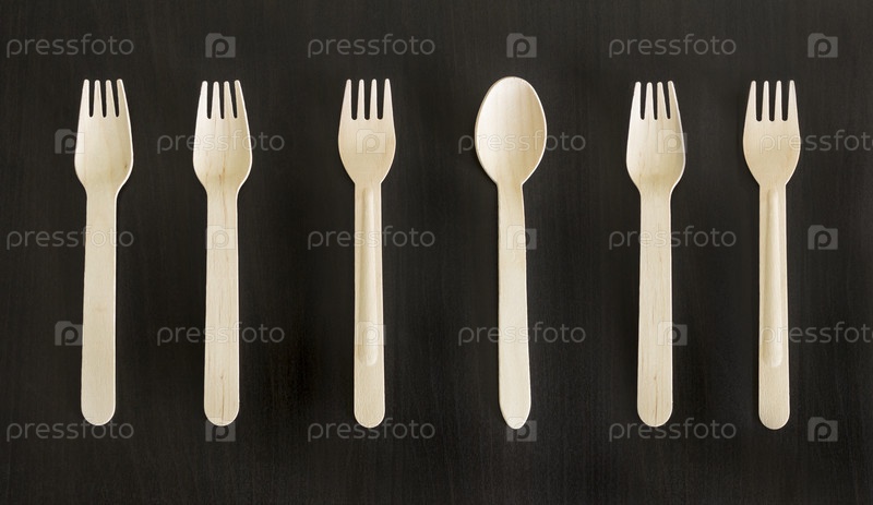 Одноразовые деревянные экологически чистые вилки и ложки для еды на вынос, еда на вынос на черном фоне. Концептуальный