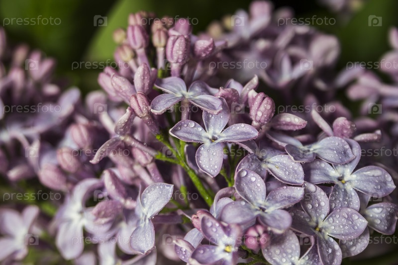 Красивый букет фиолетовых сиреневых цветов крупным планом на черном или зеленом фоне с каплями воды