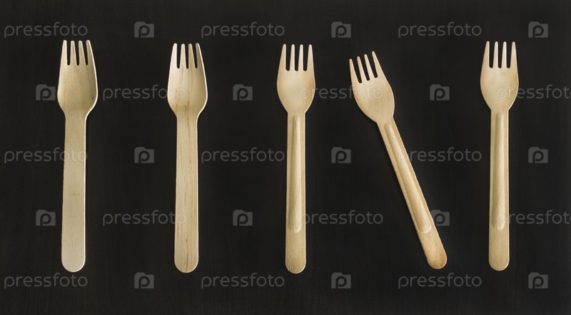 Одноразовые деревянные экологически чистые вилки и ложки для еды на вынос, еда на вынос на черном фоне. Концептуальный