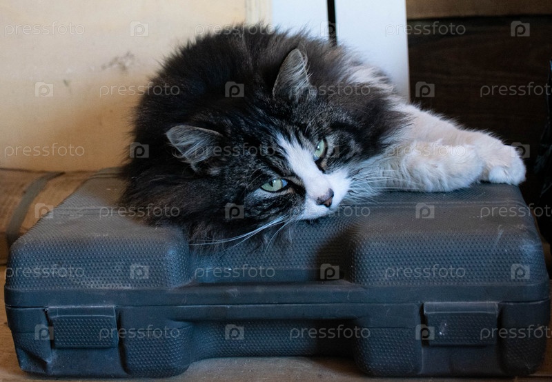 Кот разлегся на чемодане с шуруповертом