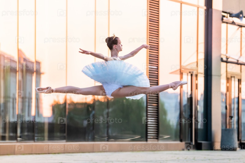 Юная балерина танцует на пуантах в нежной мятно-голубой пачке на фоне отражения заката в городе