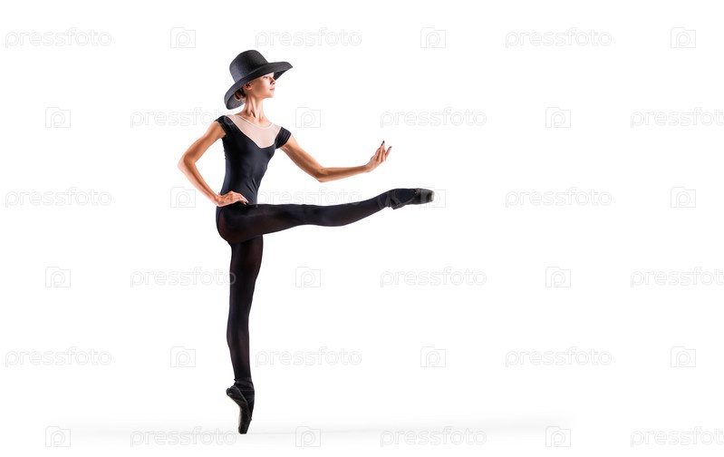 Юная балерина в черных пуантах и элегантной шляпе позирует на белом фоне