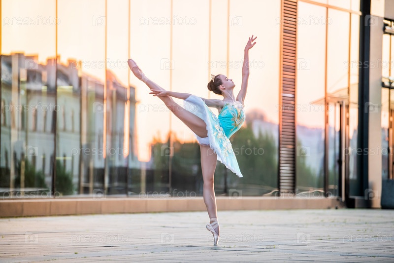 Юная балерина танцует на пуантах в нежной мятно-голубой пачке на фоне отражения заката в городе