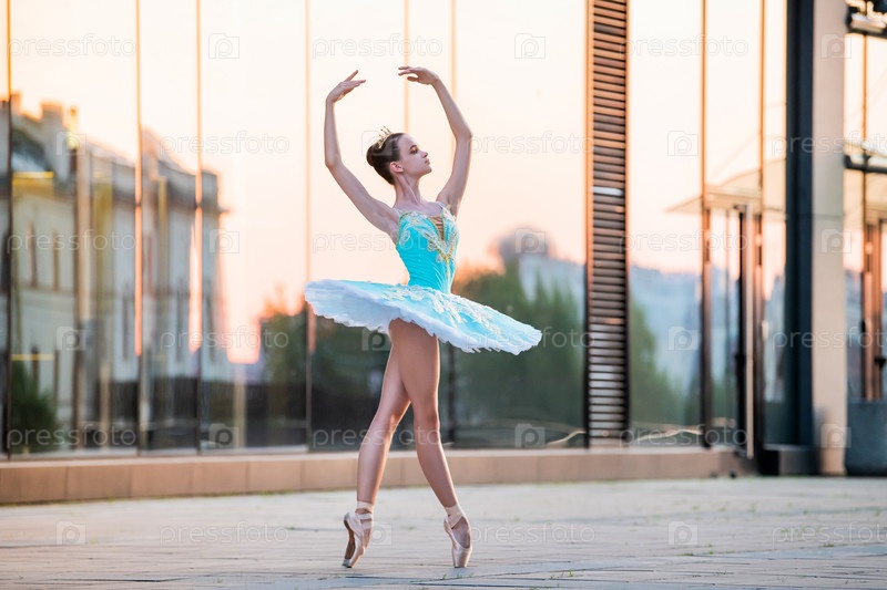 Юная балерина танцует на пуантах в нежной мятно-голубой пачке на фоне отражения заката в городе