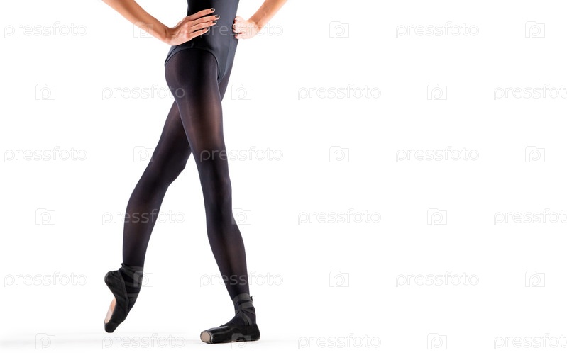 Ноги балерины в черных пуантах и трико стоят изолированно на белом фоне