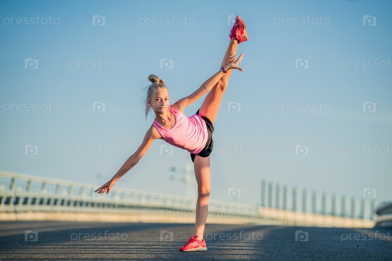 Девушка-гимнастка занимается летом на улице, на фоне голубого неба, шпагата, растяжки, арабески