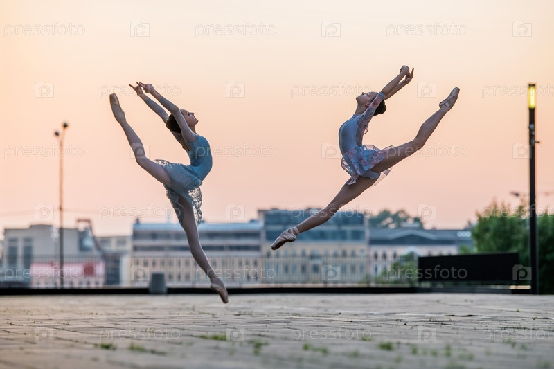 Две молодые балерины летят в прыжке в пуантах по городу на фоне закатного неба