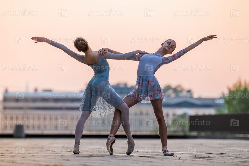 Две молодые балерины танцуют в пуантах в городе на фоне закатного неба