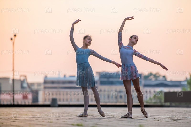 Две молодые балерины танцуют в пуантах в городе на фоне закатного неба