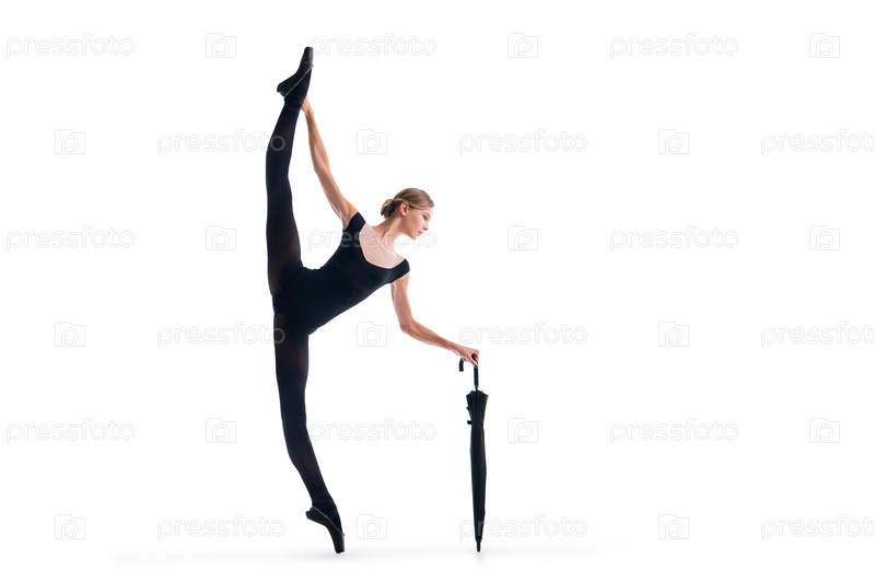 Молодая балерина в черных пуантах и купальнике позирует с зонтиком в изящной позе на белом фоне