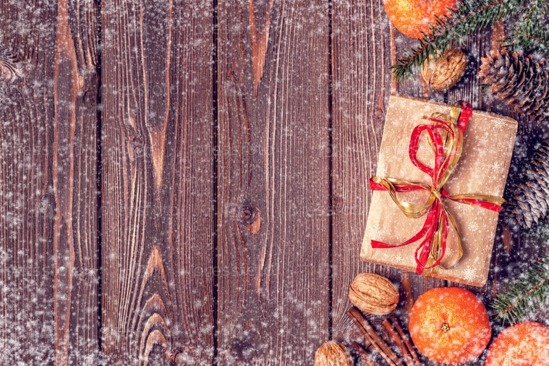 Рождественская композиция с мандаринами, подарочными коробками, шишками на темном деревянном фоне