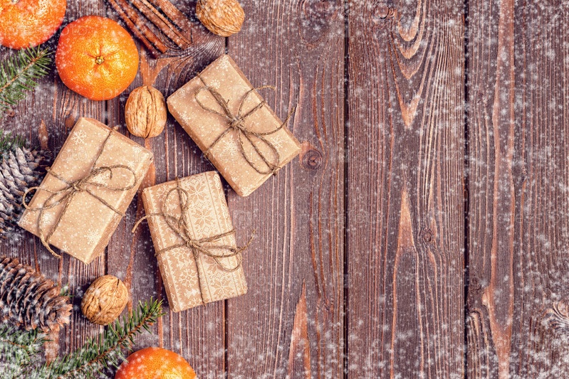 Рождественская композиция с мандаринами, подарочными коробками, шишками на темном деревянном фоне