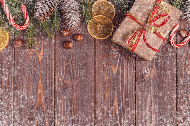 Рождественские подарочные коробки и елка на деревянном фоне