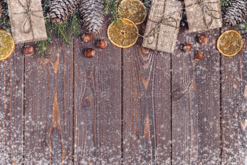 Рождественские подарочные коробки и елка на деревянном фоне