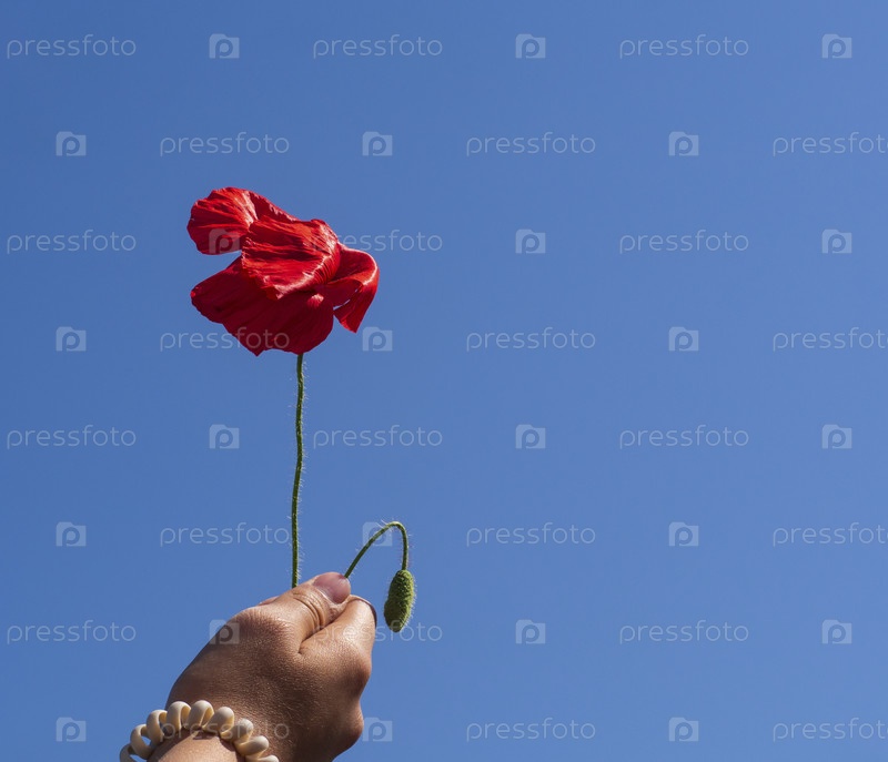 Красный цветок мака, сжатый в кулаке девушки, трепещет на ветру на фоне ясного голубого неба. Красивый цветок мака крупным планом, освещенный солнцем в прекрасный весенний день