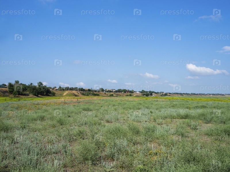 Естественный фон. По всему кадру в центре деревня на высоком берегу, над ней голубое небо с белыми облаками, в нижней части большой луг с розоватой травой