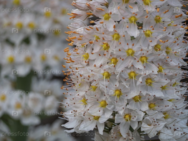 Коричневые тычинки белых цветов на размытом фоне, низкая глубина резкости, мягкий фокус