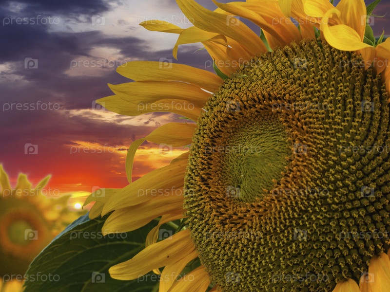 Цветущая шляпка подсолнуха на фоне красочного заката. Крупный план цветка подсолнуха с красивыми лепестками. Красивое разноцветное закатное небо с небольшим закатом солнца над горизонтом
