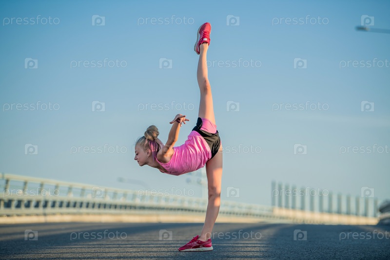 Девушка-гимнастка занимается летом на улице, на фоне голубого неба, шпагата, растяжки, арабески