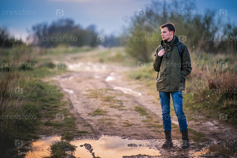 Молодой мужчина турист с рюкзаком идет по размытой грязной дороге на фоне вечернего заката