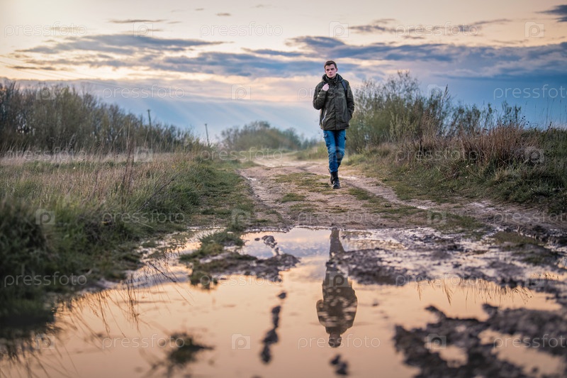 Молодой мужчина турист с рюкзаком идет по размытой грязной дороге на фоне вечернего заката