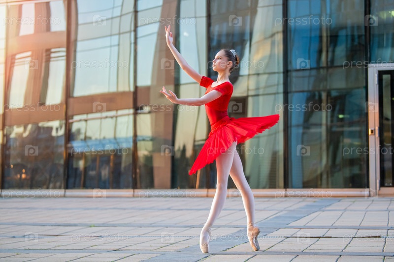 Юная балерина в красной пачке танцует на фоне городского пейзажа