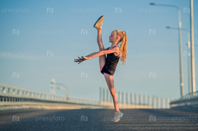 Девушка-гимнастка занимается летом на улице, на фоне голубого неба, шпагата, растяжки, арабески