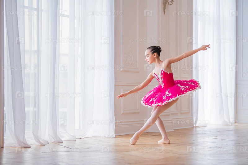 Маленькая балерина в ярко-малиновой пачке танцует в большом светлом зале