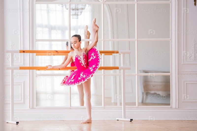 Маленькая балерина в ярко-розовой пачке занимается балетным станком перед зеркалом в красивом белом зале