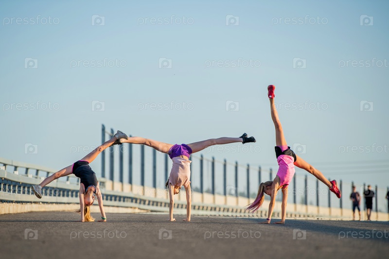 Девушки тренируются летом на улице, стоят на руках, ноги в шпагате