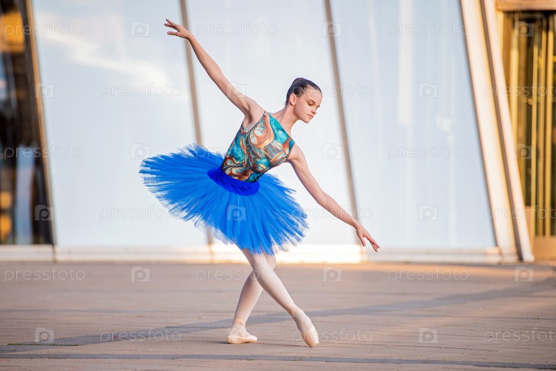 Юная балерина в ярко-синей пачке танцует на фоне городского пейзажа